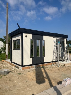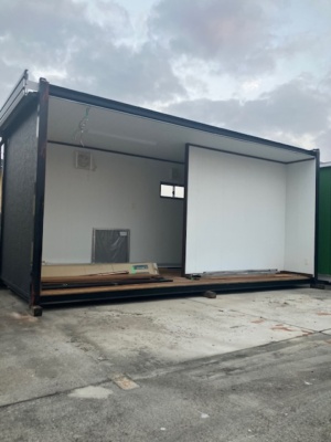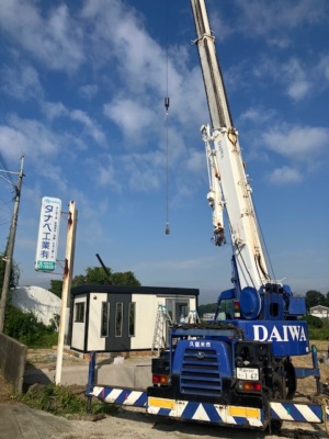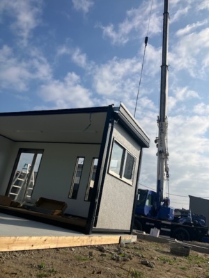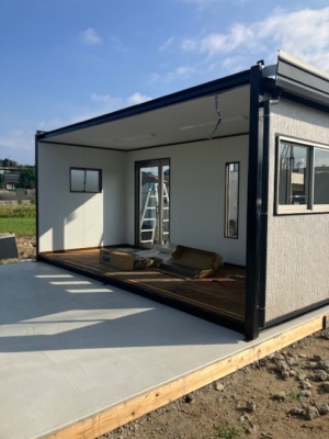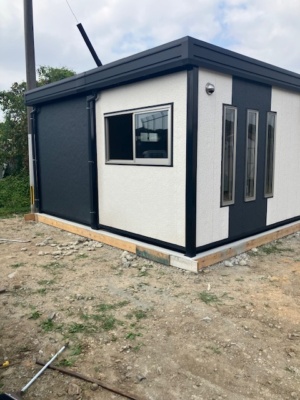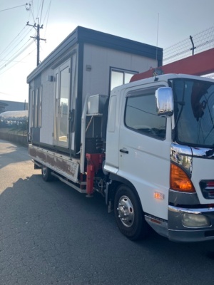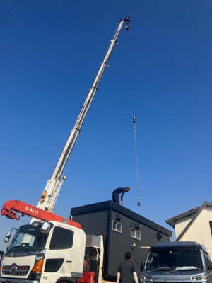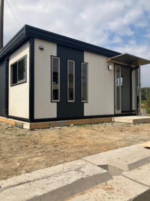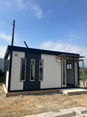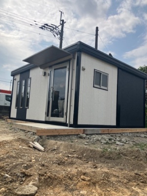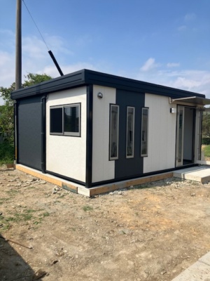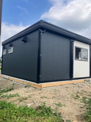 使用:外壁:金属サイディング(ツートン色)・内壁:プリント合板・パラペット・FIX窓・親子ドア・外部照明